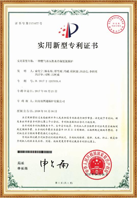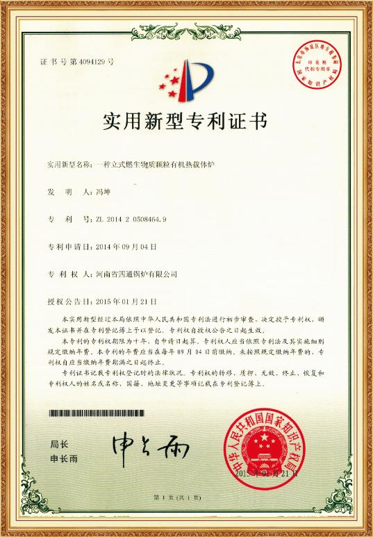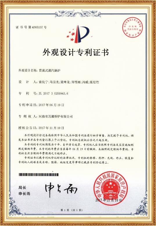 贯流式蒸汽锅炉外观设计专利证书